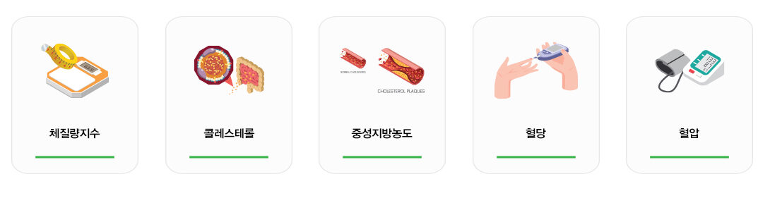 : 체질량지수, 콜레스테롤, 중성지방농도, 혈당, 혈압