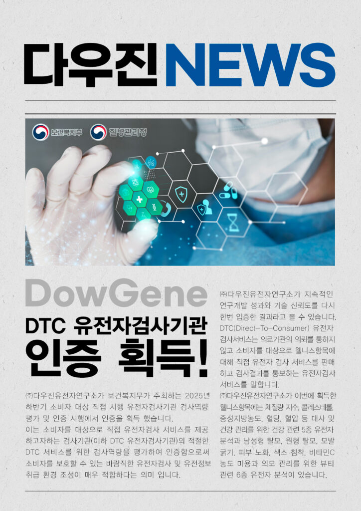 ㈜다우진유전자연구소는 이번 DTC 유전자검사기관 인증 획득을 계기로,