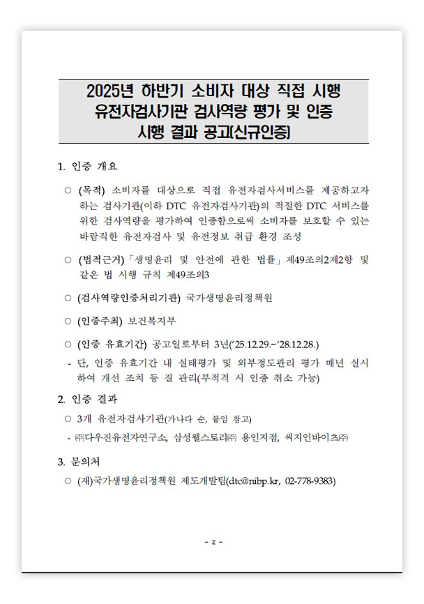 「2025년 하반기 소비자 대상 직접 시행 유전자검사기관(DTC) 검사역량 평가 및 인증」에서