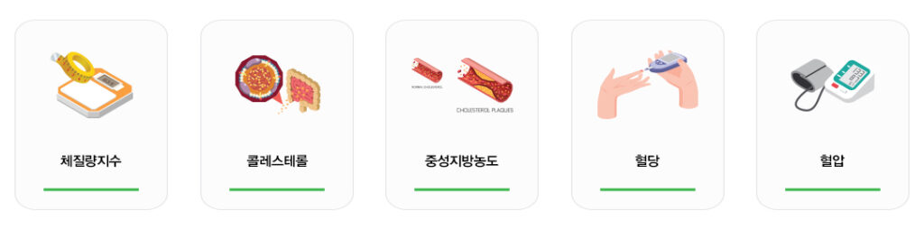 체질량 지수(BMI), 콜레스테롤, 중성지방 농도, 혈당, 혈압 등 대사 및 전반적인 건강 관리와 관련된 유전자 검사