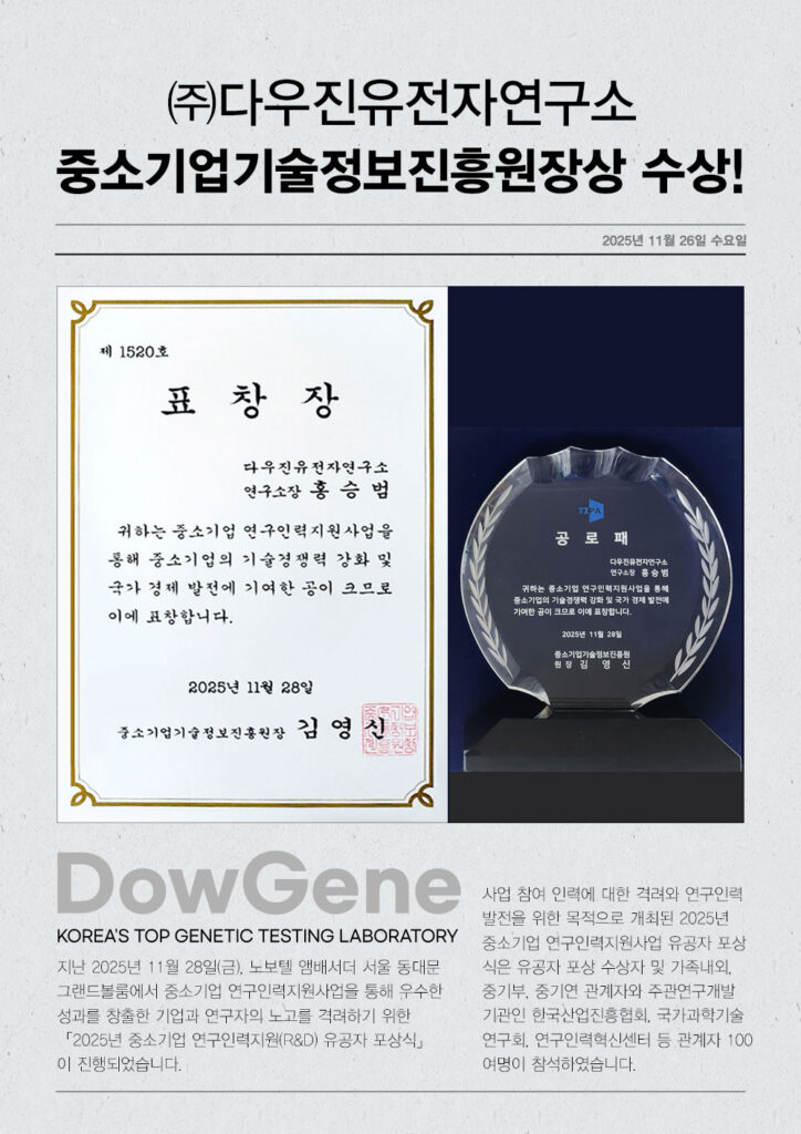 다우진유전자연구소 홍승범 연구소장이 중소기업기술정보진흥원장상을 수상했습니다.